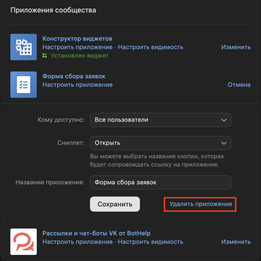 Здесь вы можете увидеть, какие приложения подключены к вашему сообществу.
