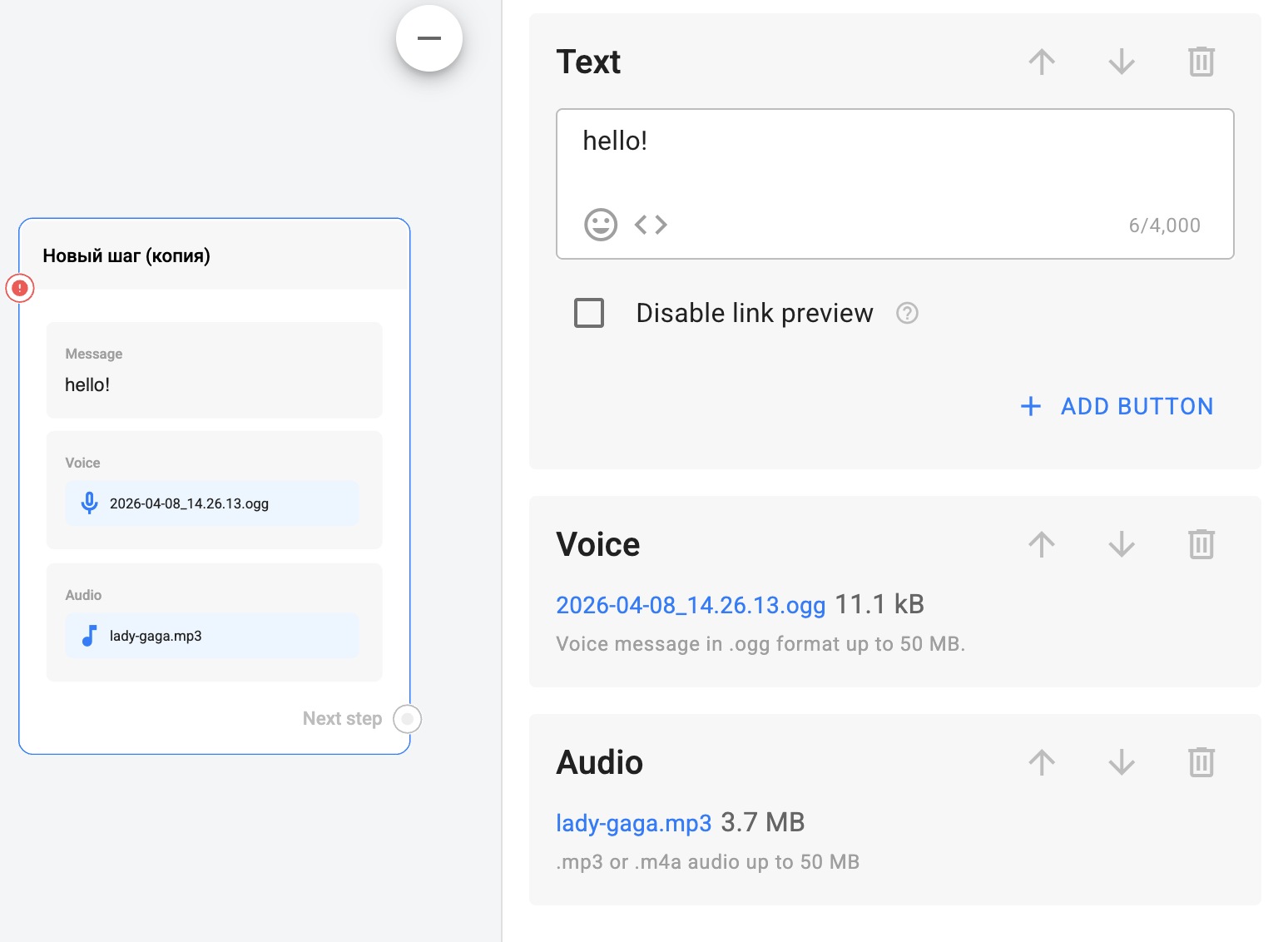 - Text message (with or without a button, max 4000 characters; text formatting not supported)