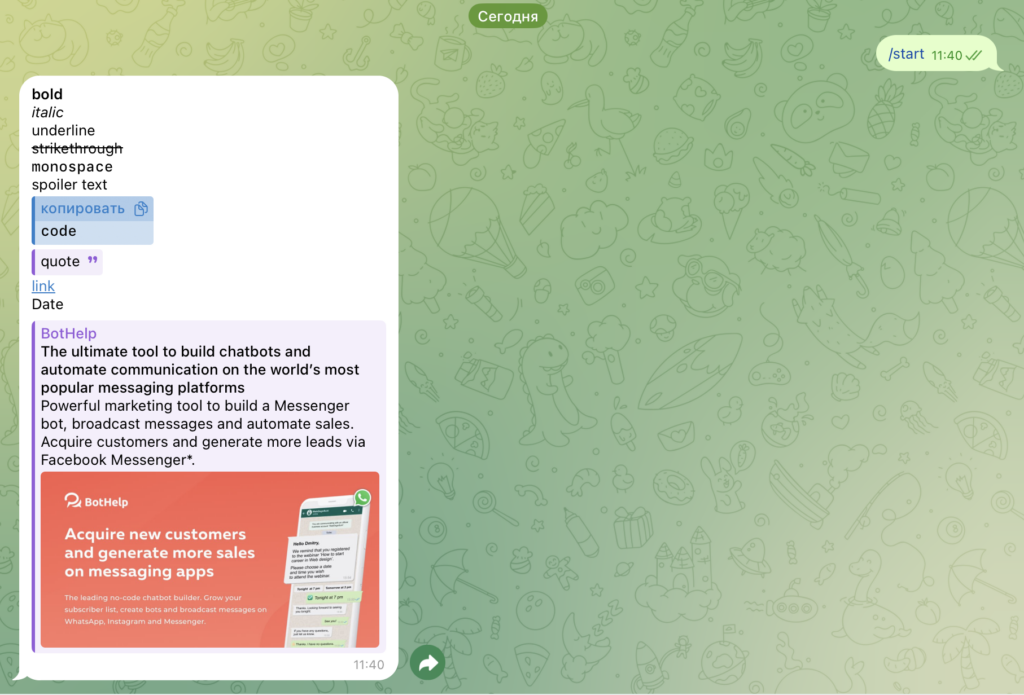 Text formatting in the Telegram messenger is available in BotHelp. You can highlight important points or key thoughts in the text to draw people’s attention to them.