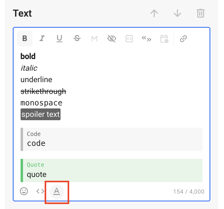 In Telegram one-time broadcasting, sequences, and chatbots, text markup is available in the following ways: bold, italics, underscores, strikethrough, and link insertion.