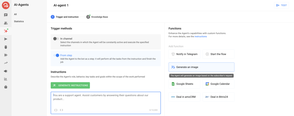 Go to the AI-agent settings. In the right-hand panel under “Functions” click Generate an image.