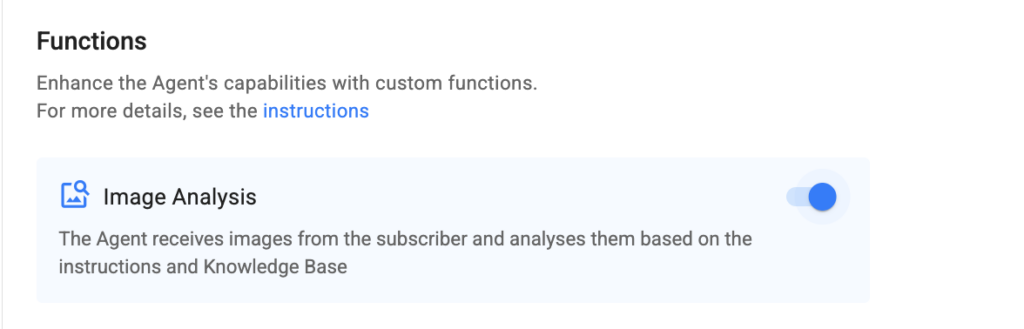— If the function is disabled, the Agent will not analyze images, tokens will not be spent. An automatic message will be sent in response to subscriber images: “Unfortunately, I cannot process attachments. Please provide information in text form, and I will be happy to help!”