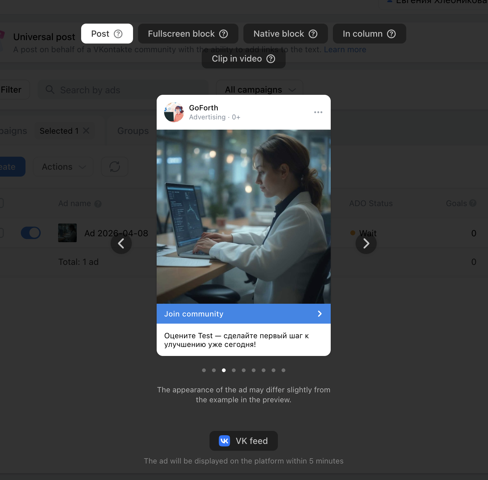 IMPORTANT! If you have several active ads, VKontakte’s algorithms can show your other published ad in the feed during testing.