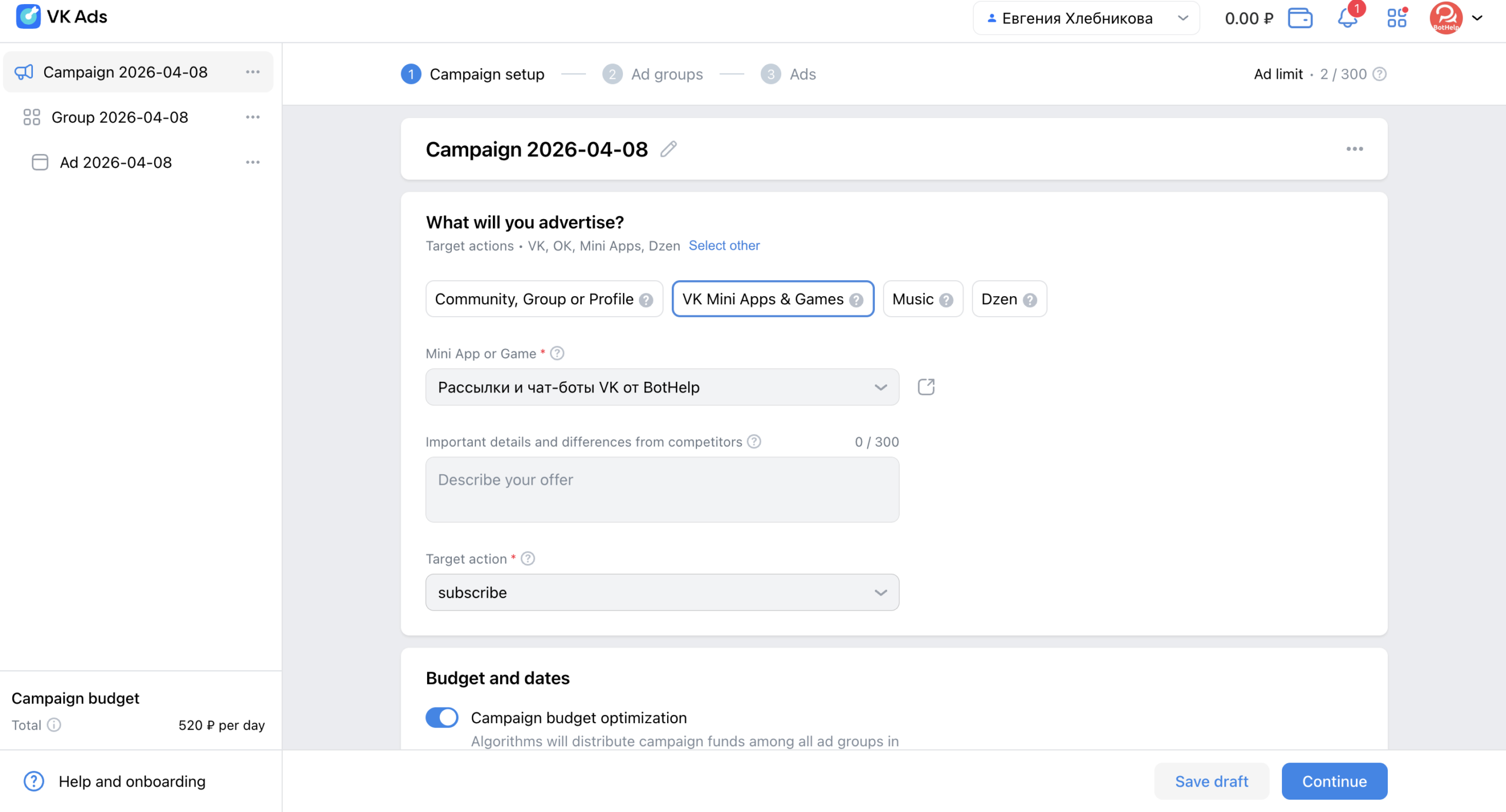 At the “Campaign” level, enter a link to the VK landing page immediately with UTM tags.
