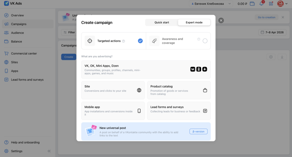 1. Log in to the VKontakte advertising profile. If you don’t have a profile yet, VKontakte will suggest creating one. Follow the instructions from VKontakte, and everything will be easy for you.