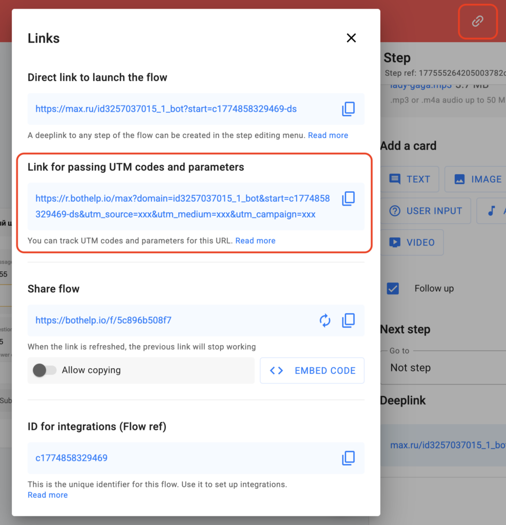 2. Copy the ready-made link for passing UTM tags and parameters, e.g., https://r.bothelp.io. The link is available for Telegram and MAX.