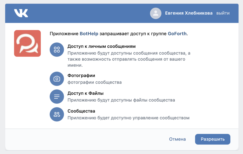 • При подключении канала теперь автоматически запрашивается полный набор необходимых разрешений • Весь функционал BotHelp для ВКонтакте работает сразу после подключения, без дополнительных действий в настройках сообщества • Для ранее подключённых сообществ список прав обновлён — дополнительная настройка больше не требуется
