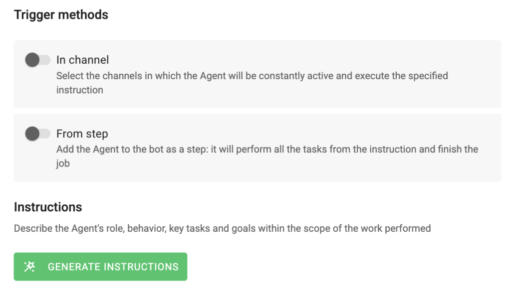 - From Step: The agent must be set up in the AI-agent section and added as a step in the bot builder.