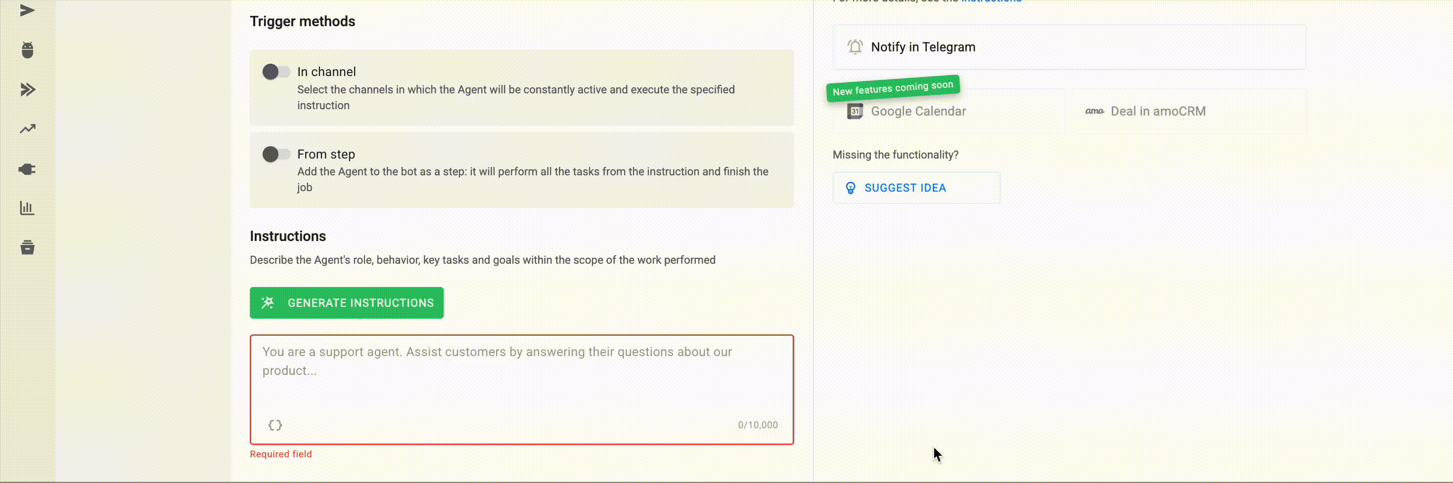 This feature simplifies the process of creating your own AI-agent. You just need to formulate a request describing the desired goals and behavioral characteristics of the agent, and the Generator will automatically transform it into a clear, structured, and precise instruction, minimizing the risk of hallucinations and incorrect behavior.