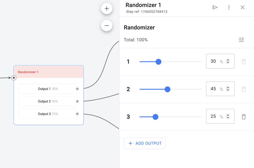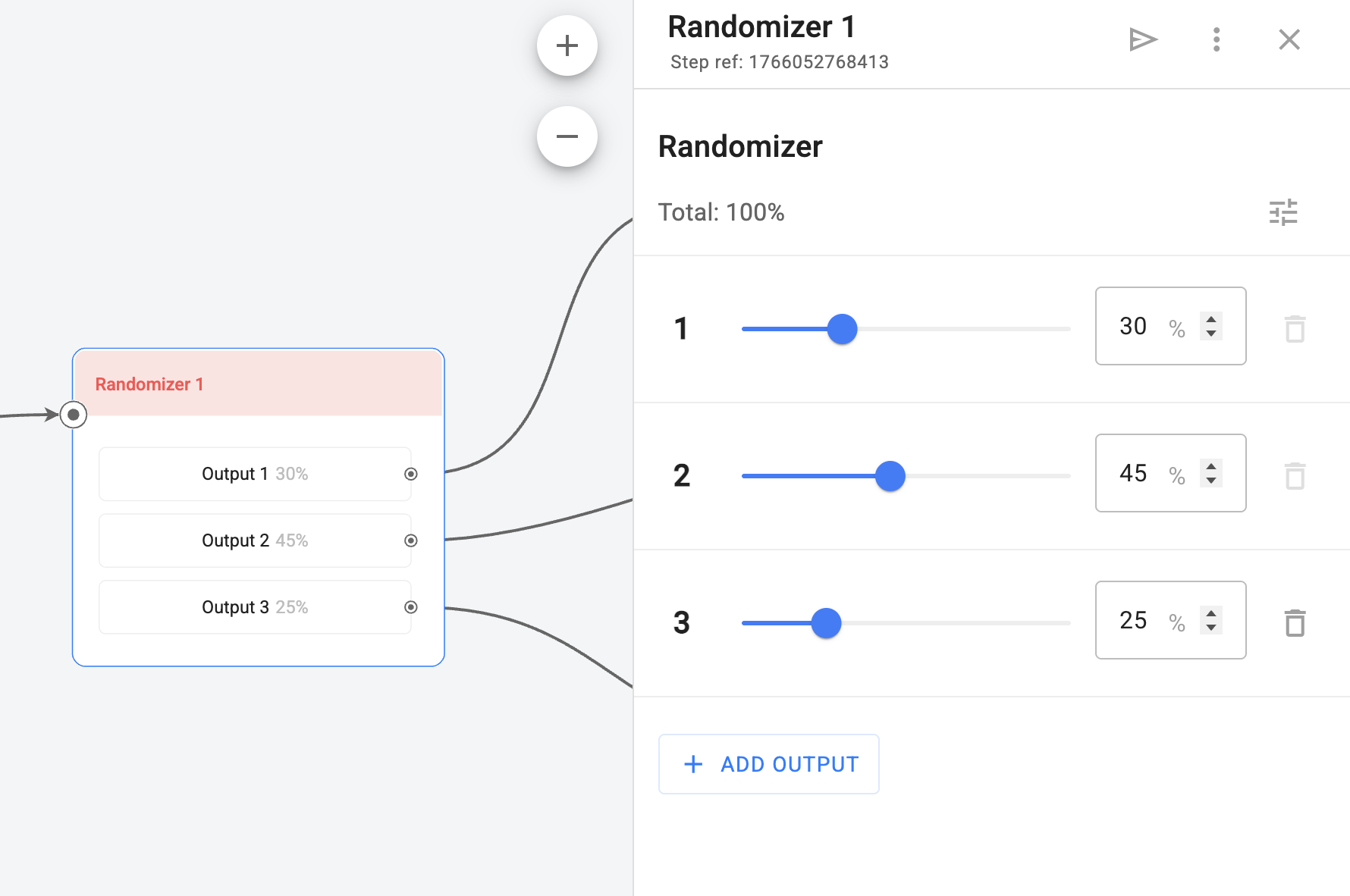 Once you set the number of outputs and configure their probabilities, the “Randomizer” step will work as follows: