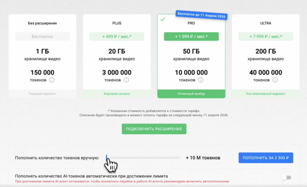 • Остаток докупленных токенов переносится на следующий месяц.