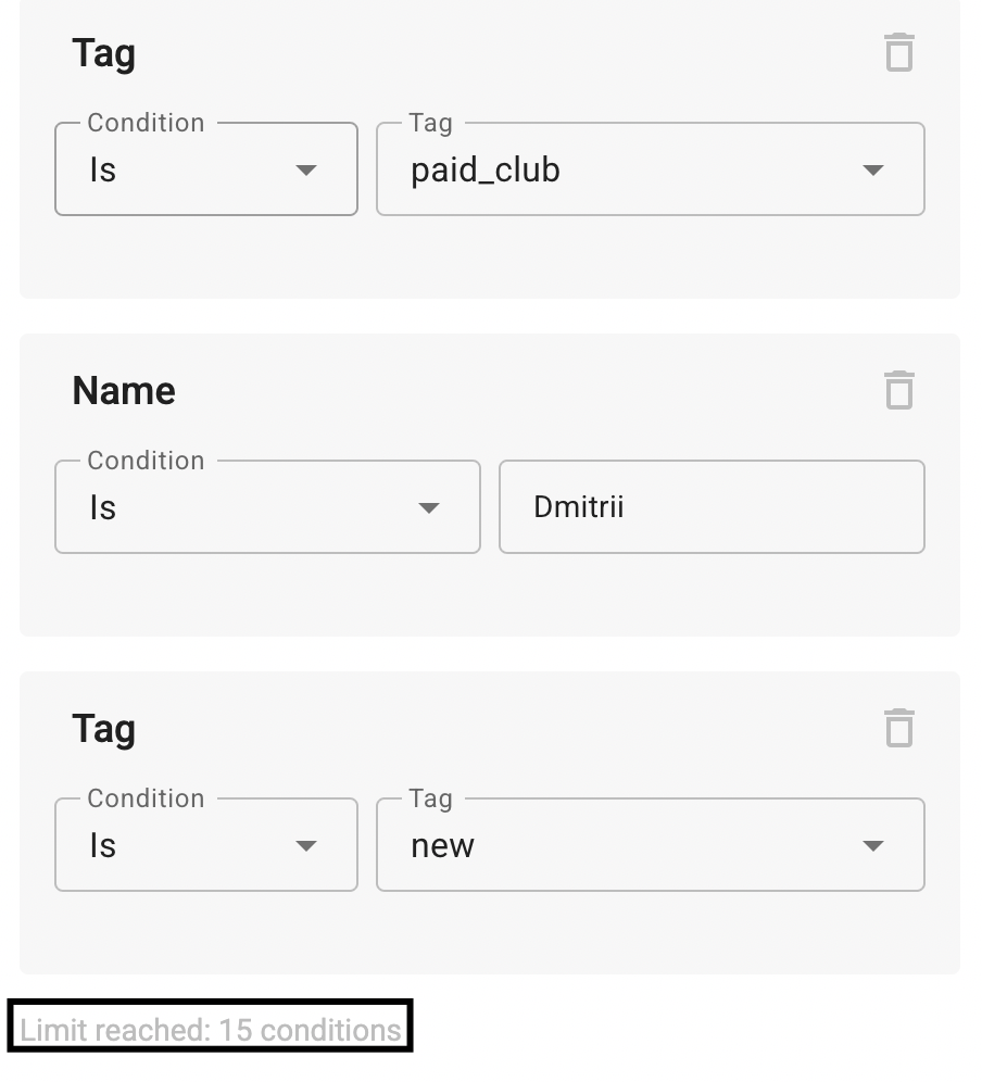 You can set a condition checking multiple tags. For example, you sell several products and assign a tag after each purchase. To continue the sequence only for those who haven’t bought yet, add all purchase tags to the condition.
