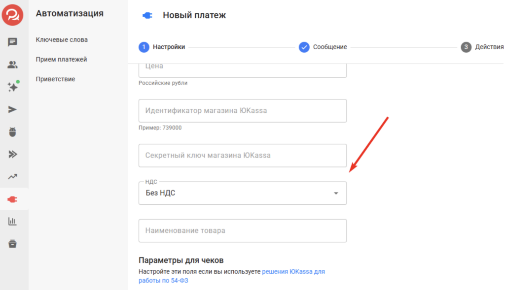 НДС — косвенный налог, который включается в стоимость товаров, работ или услуг.При приёме платежей через платёжные системы (ЮKassa, ЮMoney, Robokassa, Prodamus) вопросы НДС решаются в зависимости от нескольких факторов: статуса продавца, условий договора с платёжным сервисом, а также от того, как именно организован процесс приёма платежей и формирования чеков.В настройке автоматизации «Прием платежей» можно установить НДС в разделе Настройки для ЮKassa