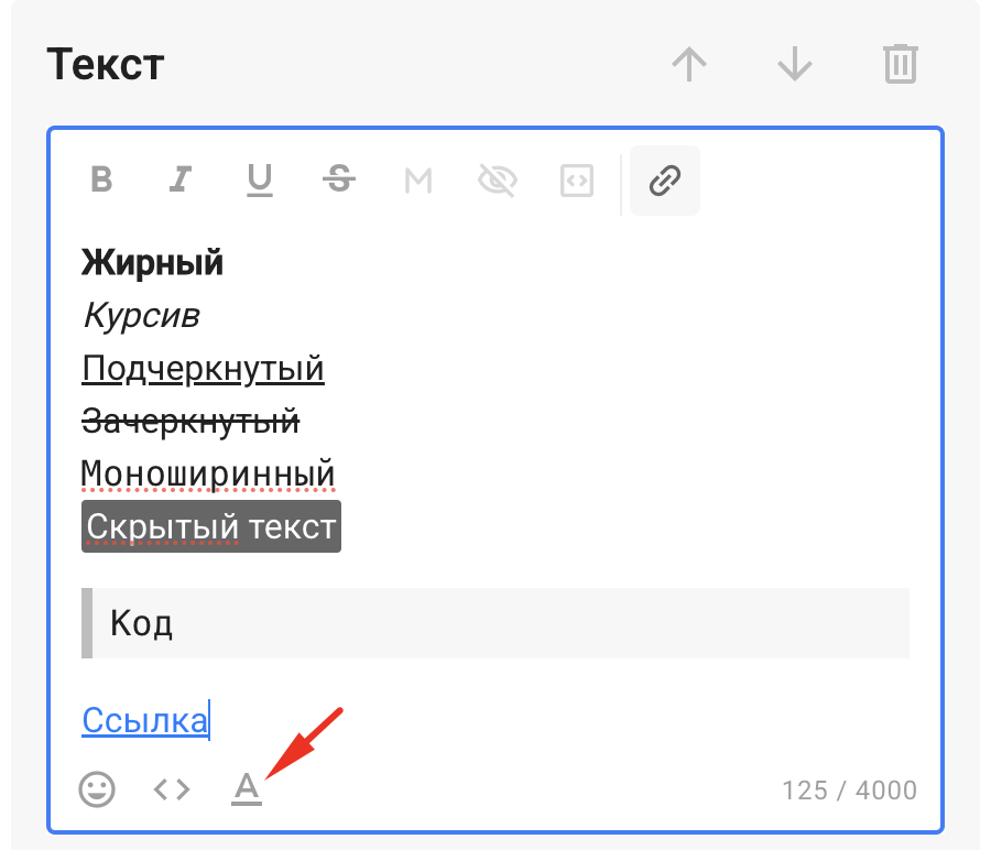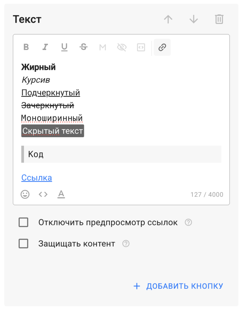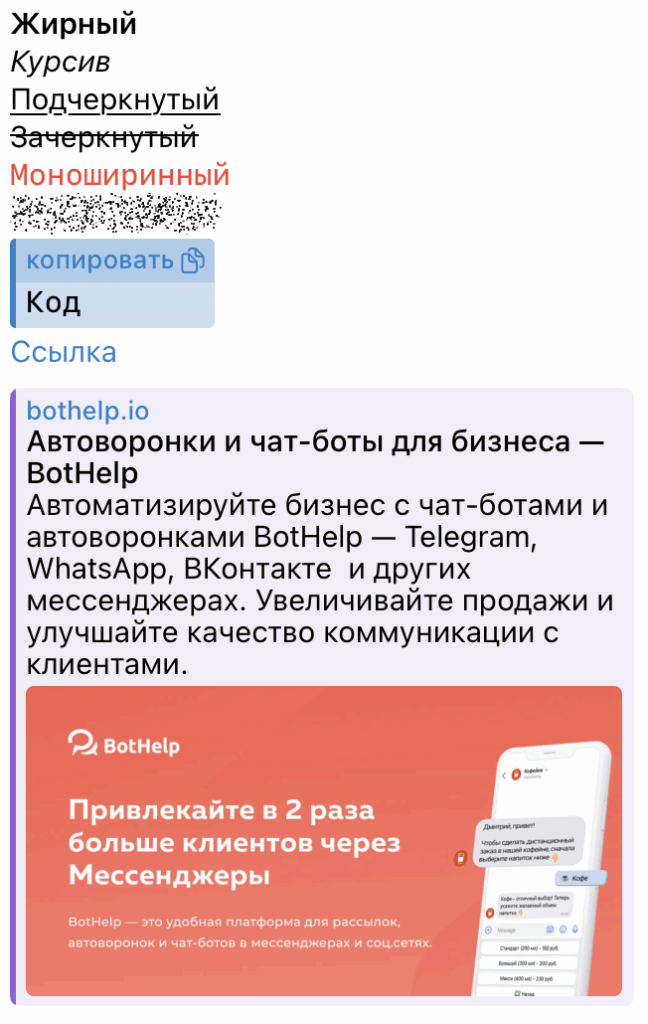 В разовых рассылках, авторассылках и чат-ботах Telegram доступна разметка текста следующего вида: выделение жирным, курсивом, подчёркиванием, зачёркиванием, моноширинный, скрытый текст, код и вставка ссылки.