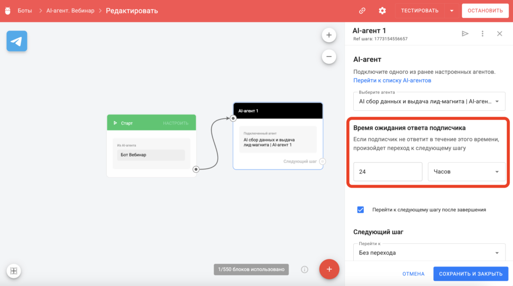 Можно настроить время ожидания ответа подписчика для AI-агента от 1 минуты до 99999 часов.