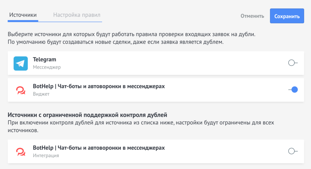 5. В настройках источников отключить источники с ограниченной поддержкой контроля дублей, включая виджет BotHelp.