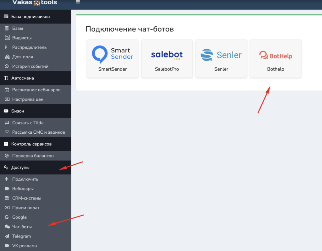 - Подключите BotHelp к Vakas-tools. Для этого: