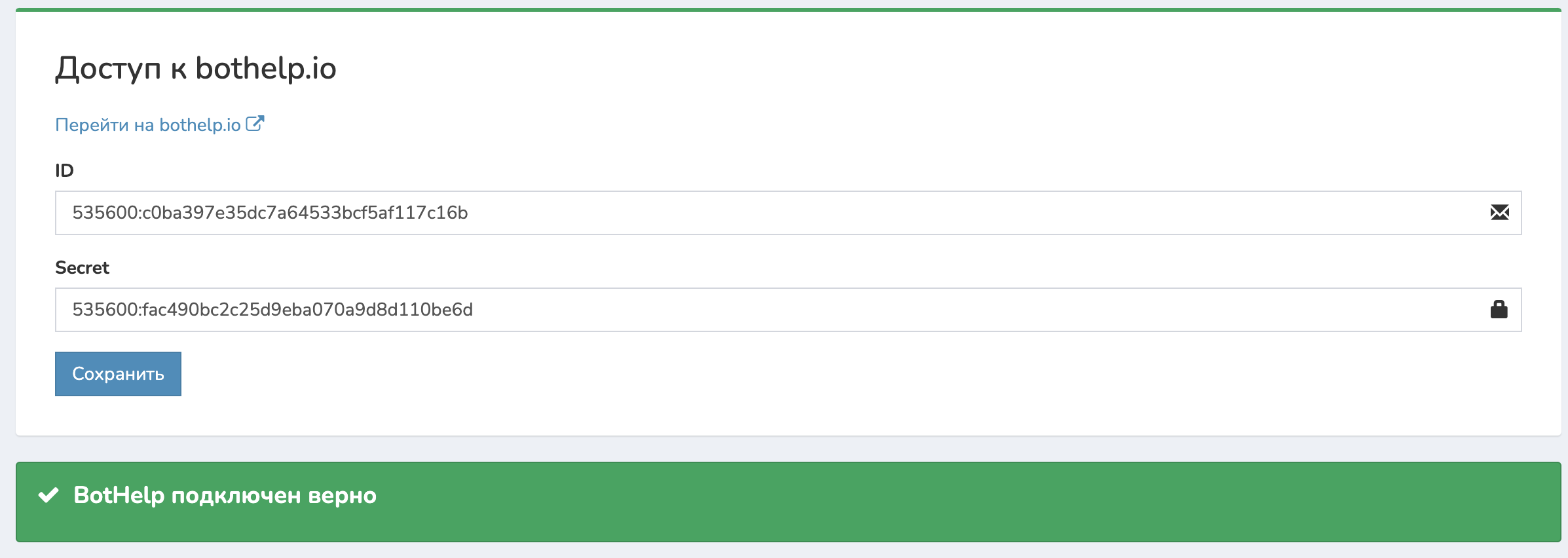- В кабинете Vakas-tools в разделе «Доступы» в подразделе «Чат-боты» откройте страницу BotHelp и вставьте скопированные значения ID и Secret.