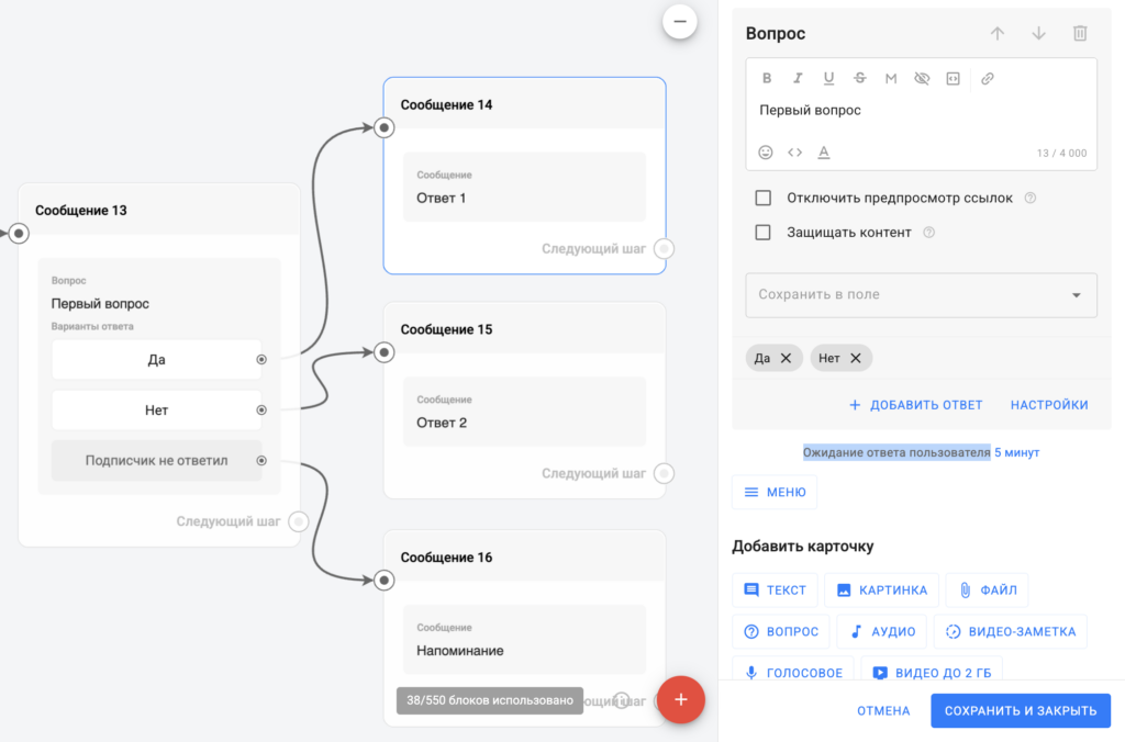 ❌ Карточка «Вопрос» в шаге «Сообщение» уже сама ждёт ответа пользователя столько, сколько вы указали в ее настройках.