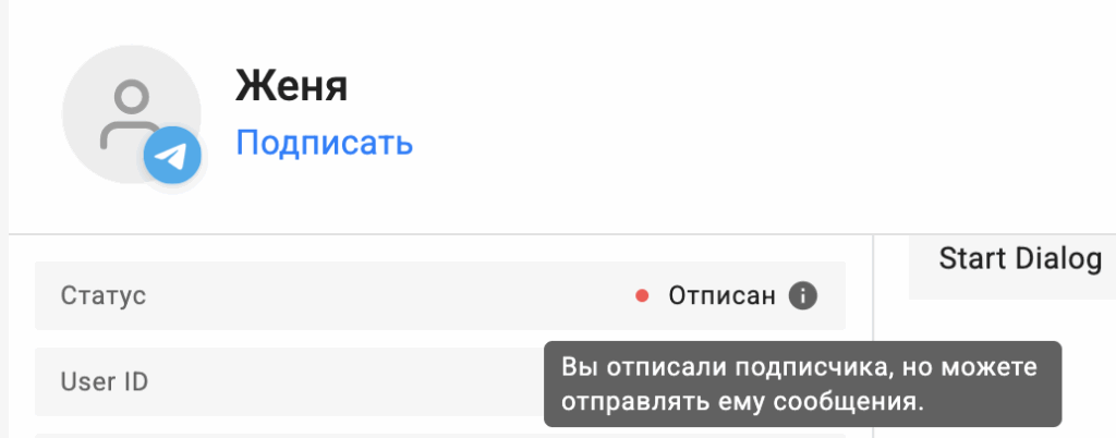 Как только для подписчика сработает это действие, он останется вашим подписчиком, но не будет получать сообщения, пока повторно не подпишется на рассылку/бота. Открыв карточку такого подписчика, его статус изменится на Отписан.