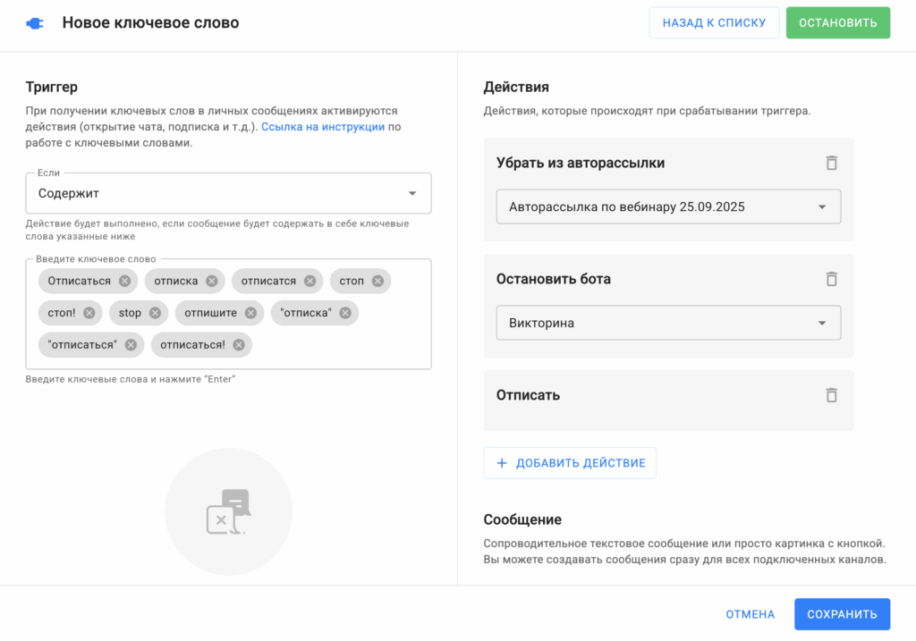 - Укажите слова, при вводе которых будет выполняться действие — например, отписка.