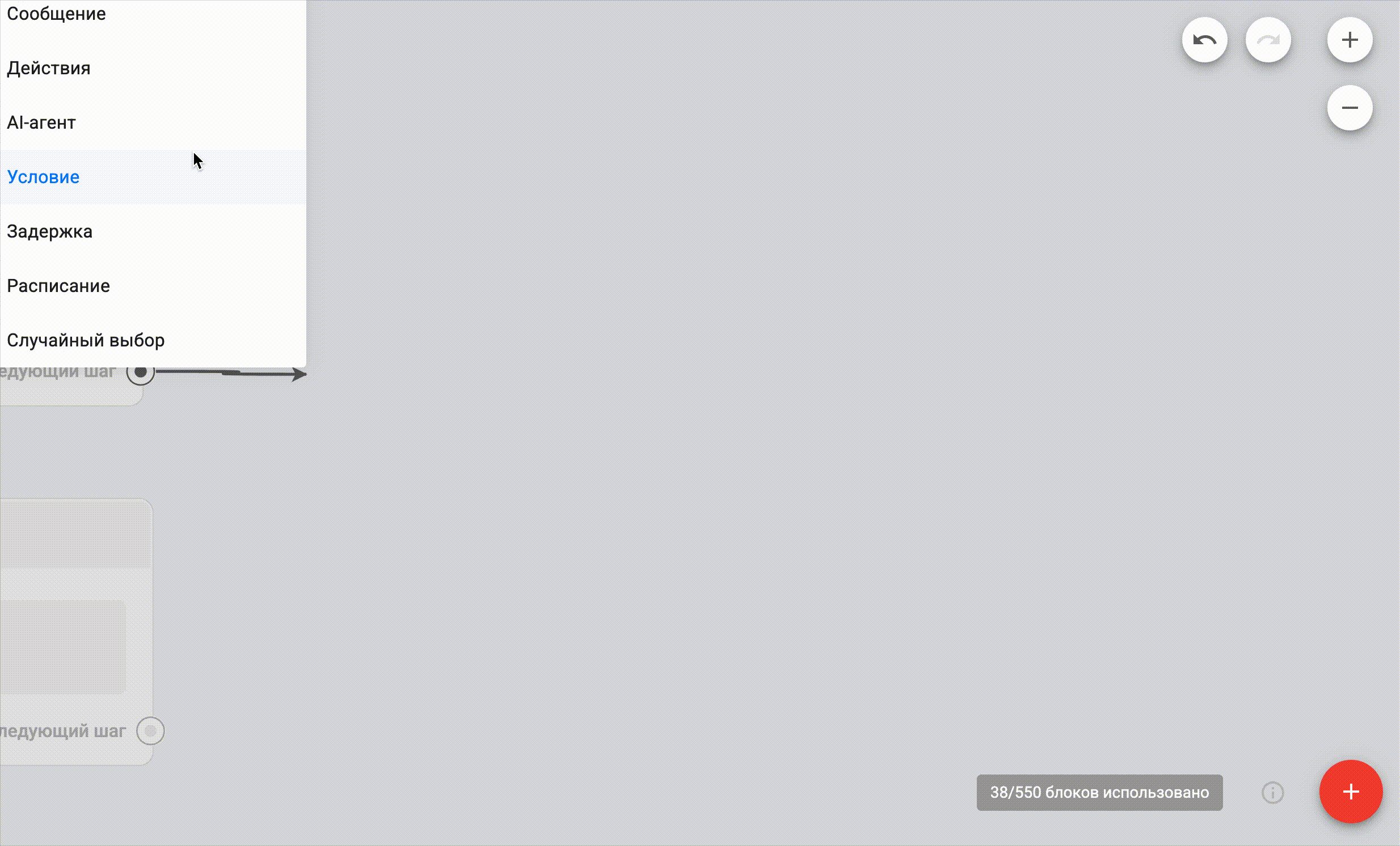 - в конструкторе многошагового бота добавьте новый шаг «Действие»;