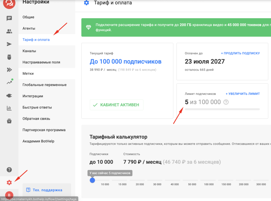 Активный подписчик — это подписчик, которому вы можете отправить сообщение. Посмотреть количество активных подписчиков вы можете в разделе Тариф и Оплата.