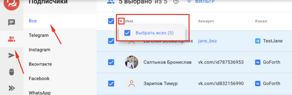 Чтобы выбрать конкретного подписчика, нажмите на чек-бокс рядом с его именем.