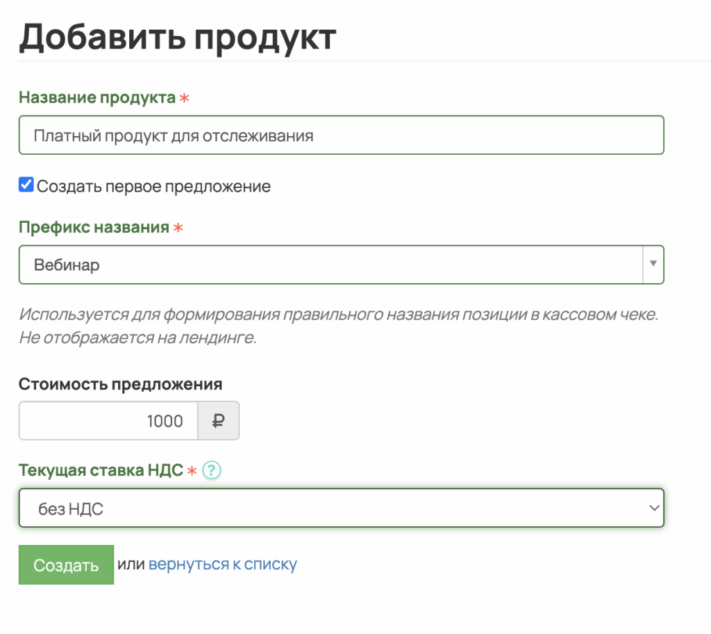 - Задайте стоимость предложения для этого продукта и укажите НДС.