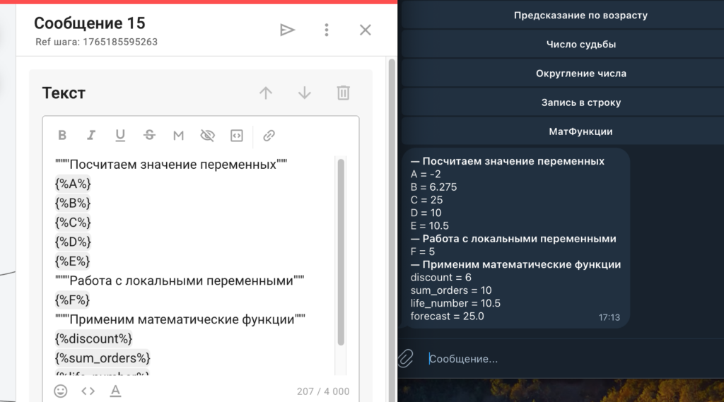С его помощью можно присваивать значения полям и переменным, рассчитывать показатели, сравнивать данные и строить сложные сценарии прямо внутри BotHelp.