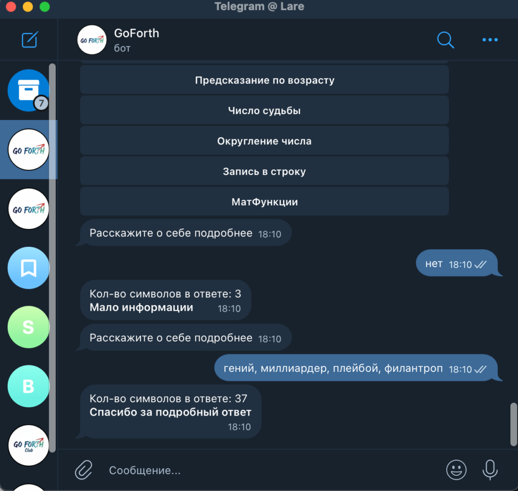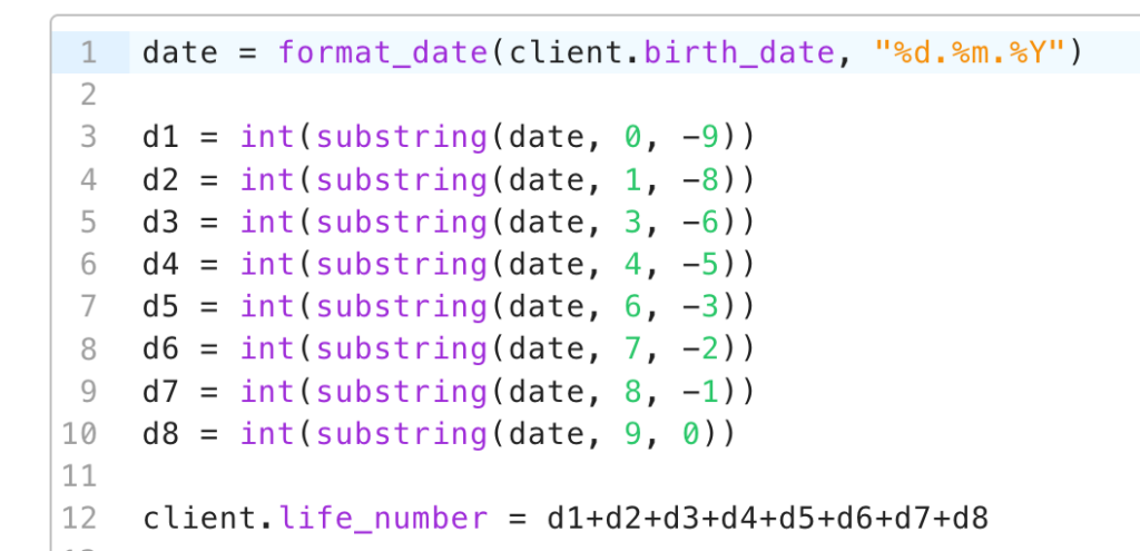 - В 11 строке суммируем полученные цифры из даты рождения в переменную life_number для вывода ответа подписчику.