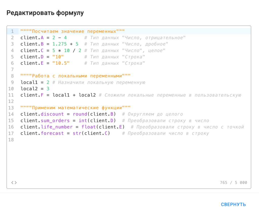 Шаг «Формула» — это блок редактора кода, где можно выполнять логические и арифметические действия, использовать встроенные функции и управлять переменными.