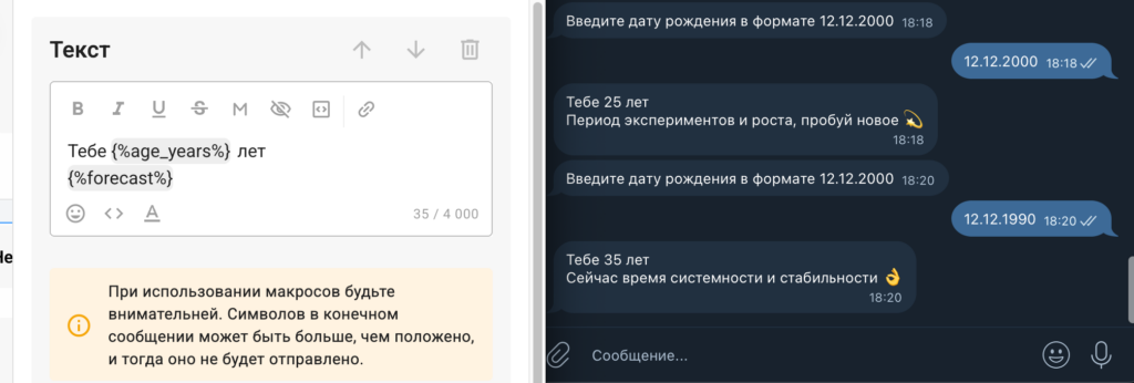 Результат, который вы увидите в конструкторе и который увидит подписчик в чате с ботом.