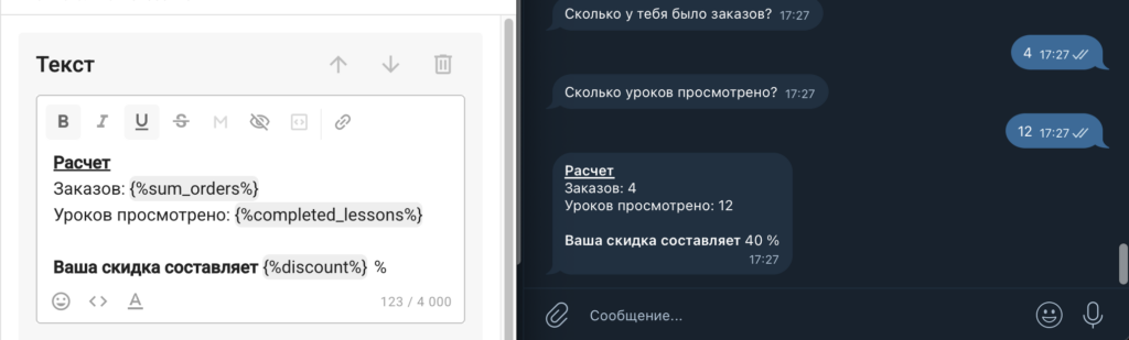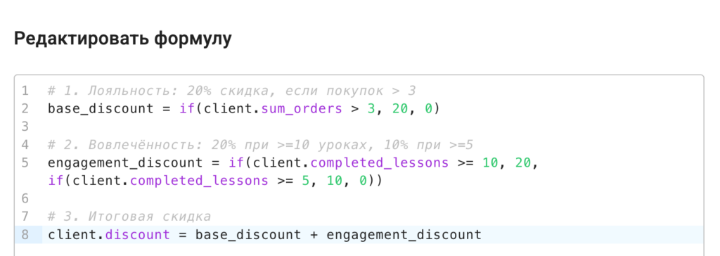 discount = base_discount + engagement_discountПолученное значение записывается в пользовательскую переменную discount, которую можно показать подписчику в следующих шагах сценария.