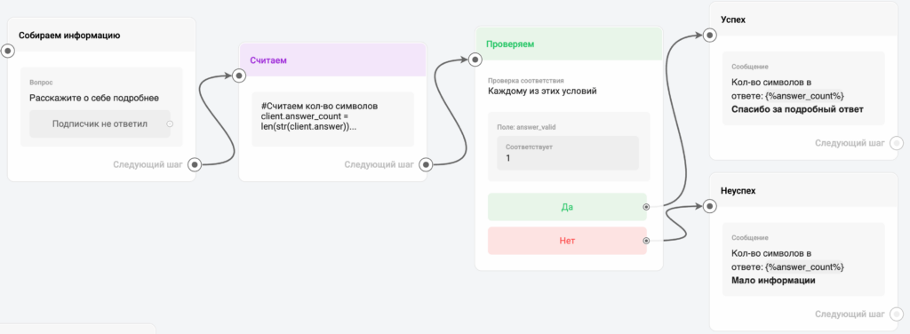 При успешном выполнении значения записываются в выбранные переменные, и бот идёт дальше по настроенному переходу «Следующий шаг».
