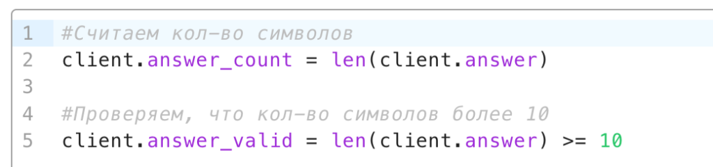 В 5 строке — выполняем логическое условие — если больше 10, то в переменную answer_valid будет записано значение 1. Если меньше — 0.