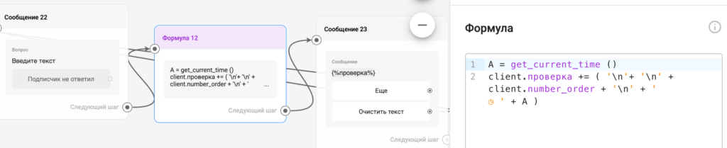 Шаг «Формула» — это блок редактора кода, где можно выполнять логические и арифметические действия, использовать встроенные функции и управлять переменными.