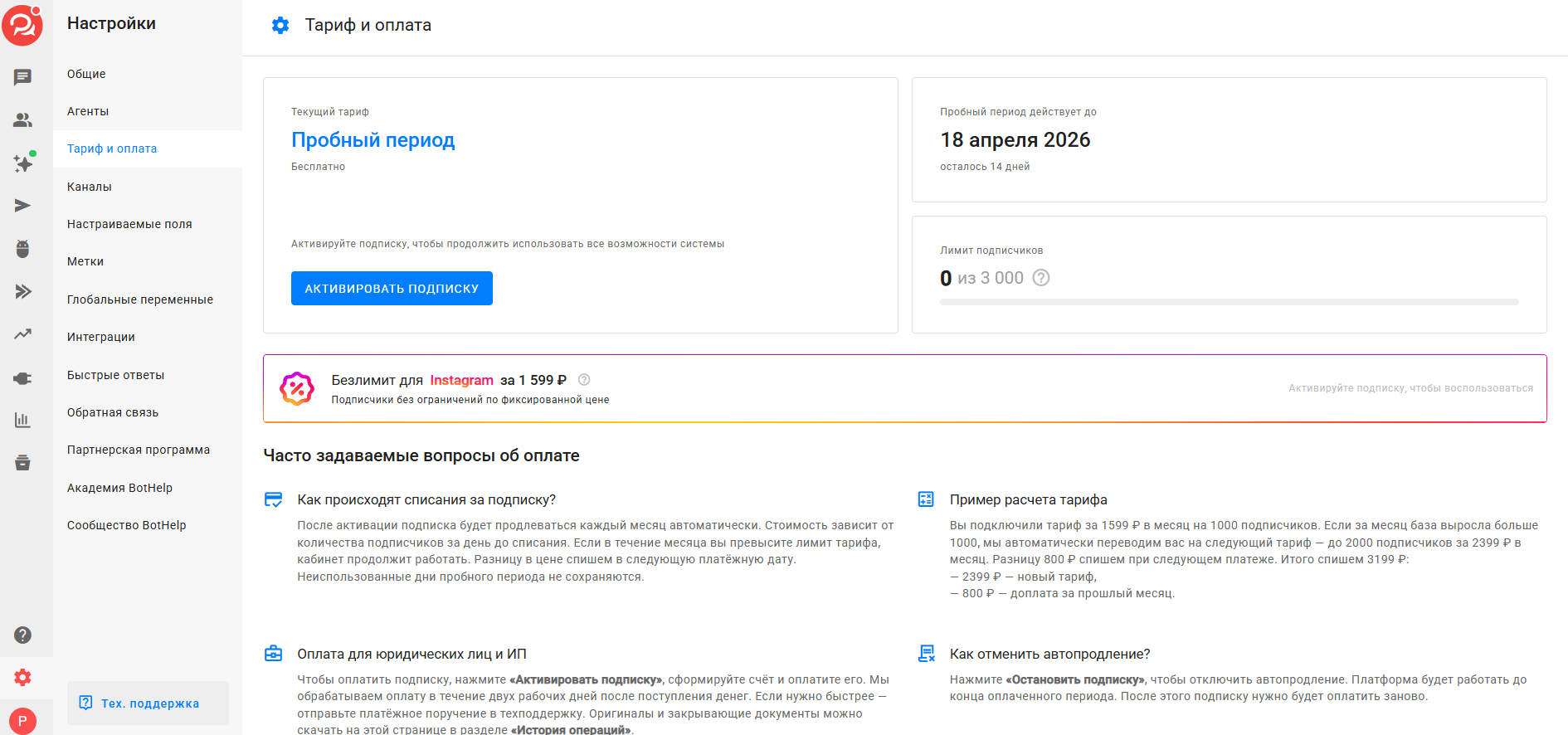 В BotHelp нет бесплатных тарифов. Минимальный тариф до 1000 подписчиков начинается от 1599 руб. Но вы можете воспользоваться тестовым периодом 14 дней.
