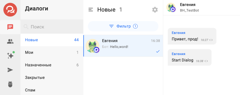 На любой диалог можно ответить, пометить как спам, назначить на себя или другого агента или закрыть.