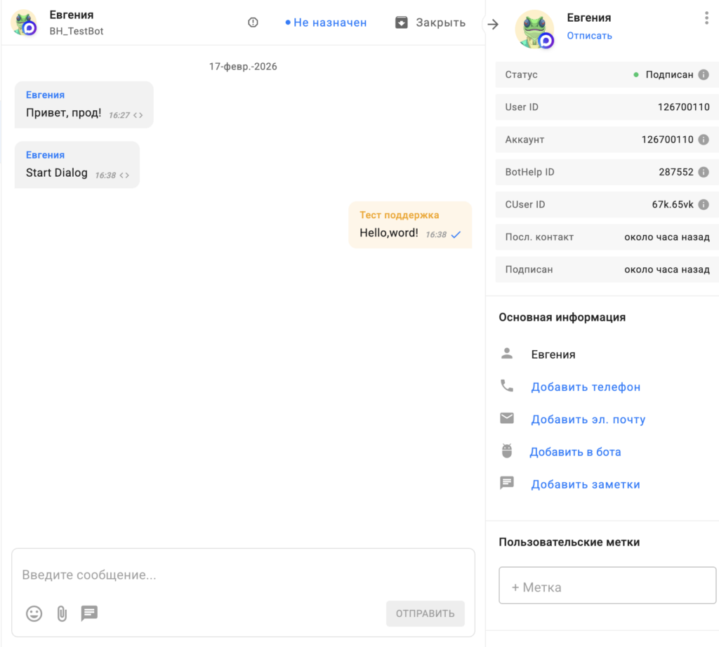 Справа диалога находится карточка подписчика с основной информацией и метками.
