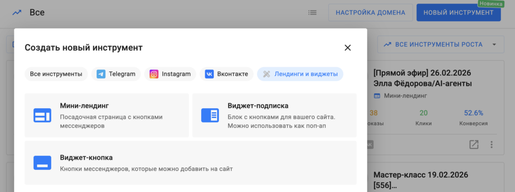 Для создания мини-лендинга выберите раздел «Инструменты роста» слева в меню. Далее нажмите «Новый инструмент» и выберите из списка мини-лендинг в разделе «Лендинги и виджеты».