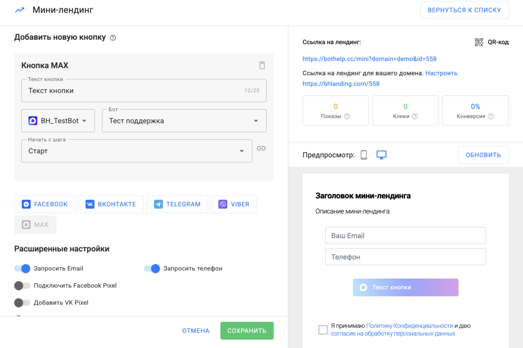 • Сохраните и скопируйте ссылку на мини-лендинг.