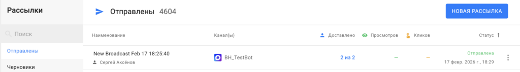 После отправки вы увидите вашу рассылку в отправленных, а так же сможете посмотреть статус и статистику по доставке, просмотрам и кликам. Рассылку можно скопировать в другой мессенджер через три точки сбоку.