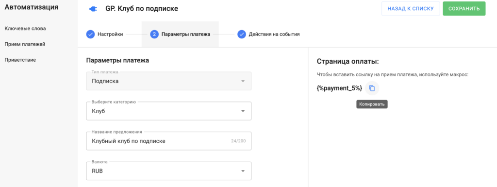 Заполните все настройки, параметры платежа и действия на события по инструкции.