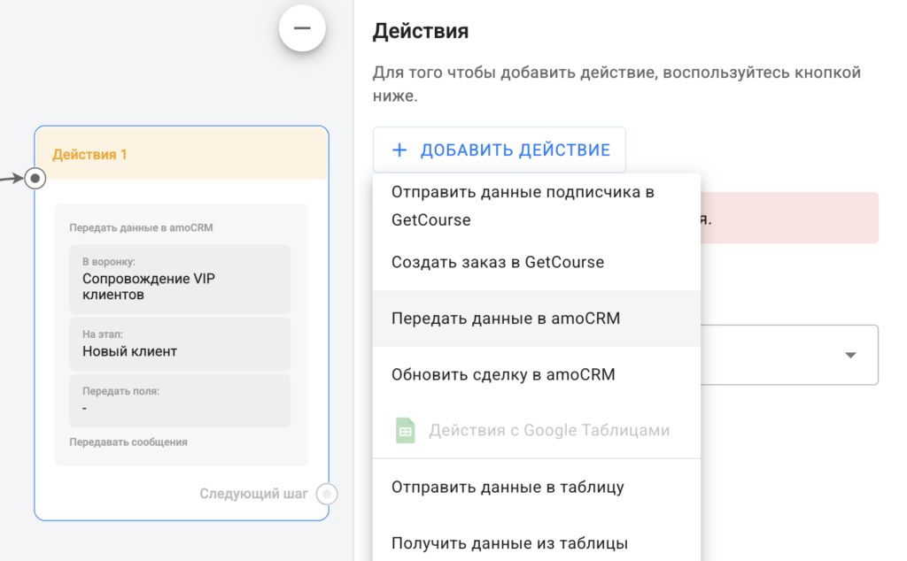 После того, как вы подключите интеграцию к вашему кабинету, перейдите в бота MAX и выберите шаг «Действия». Нажмите «Добавить действие» и выберите «Передать данные в amoCRM».