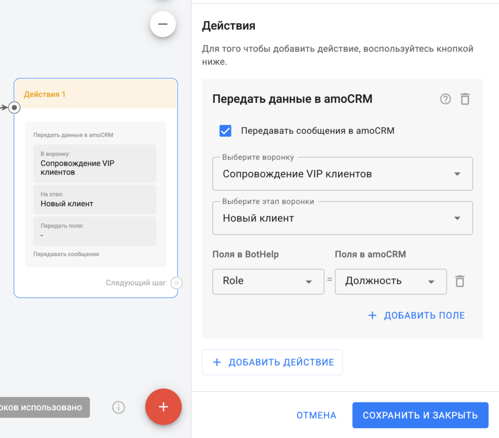 Вы можете передавать данные из полей BotHelp в поля amoCRM. Для этого выберите их через кнопку «Добавить поле».