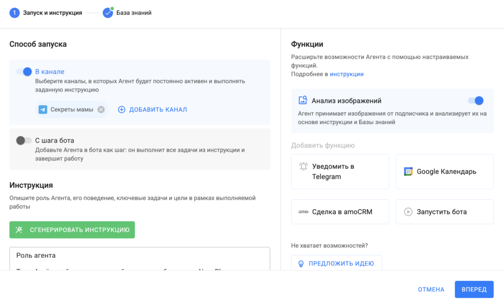 Не забудьте выбрать способ запуска, сгенерировать инструкцию и указать текст или файл для Базы знаний.